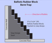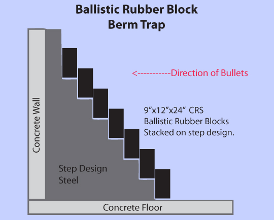 For example, a Rubber Berm Trap will consist of an angled support structure with rubber media, rubber sheets, or rubber blocks covering berm. An angled steel trap will utilize an AR500 steel backstop while hanging ballistic curtains or sheets to provide range safety. The design concepts will to stop or control the round as well as decrease bullet ricochets. In many designs, steel or dirt is not enough to provide a safe live fire environment. With the addition of rubber, a range will substantially decrease ricochets off of steel or rocks.